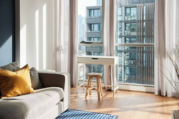 Large windows allow streams of natural light to flow through. The living and kitchen space is free flowing, opening to a private balcony. Take a moment here over your morning coffee or a favourite book, then there’s a plush sofa for cosy nights in and a TV for your evening entertainment. Those needing to work from home can make use of the small desk or larger dining table beside the kitchen. Dining is made easy with countless eateries close by, or whip something up on the kitchen’s sleek appliances and utensils.