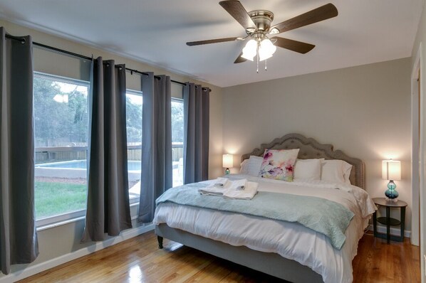 Komplett renoviert, privater Pool Haus mit 4 Kingsize-Bett / 3 Vollbäder, befindet sich auf 1. 2 Hektar alten Eichenhängematte weniger als 5 Minuten von der Innenstadt von Melbourne. 4 Meilen zum Strand. Schnelle 19 Meilen / 26 Minuten zum USSSA Sports Complex in Viera. Hervorragende Raumaufteilung für große Gruppen / Familien.
