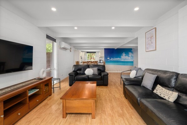 The property has a large smart TV with Wi-Fi, large split heating and cooling unit, a large dining table and modern kitchen with dishwasher.