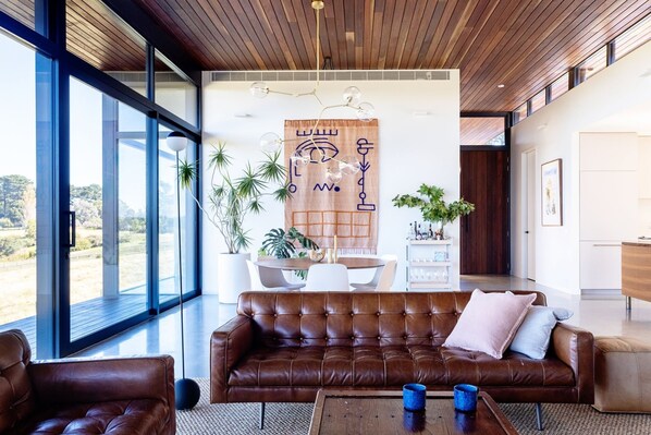 The living room centres around a freestanding fireplace and generous sofa, while the dining area opens directly onto the full-length verandah. Here, views stretch over the property’s dam and onto rolling hills with hints of sea views - an ideal spot for morning coffee or sunset drinks.