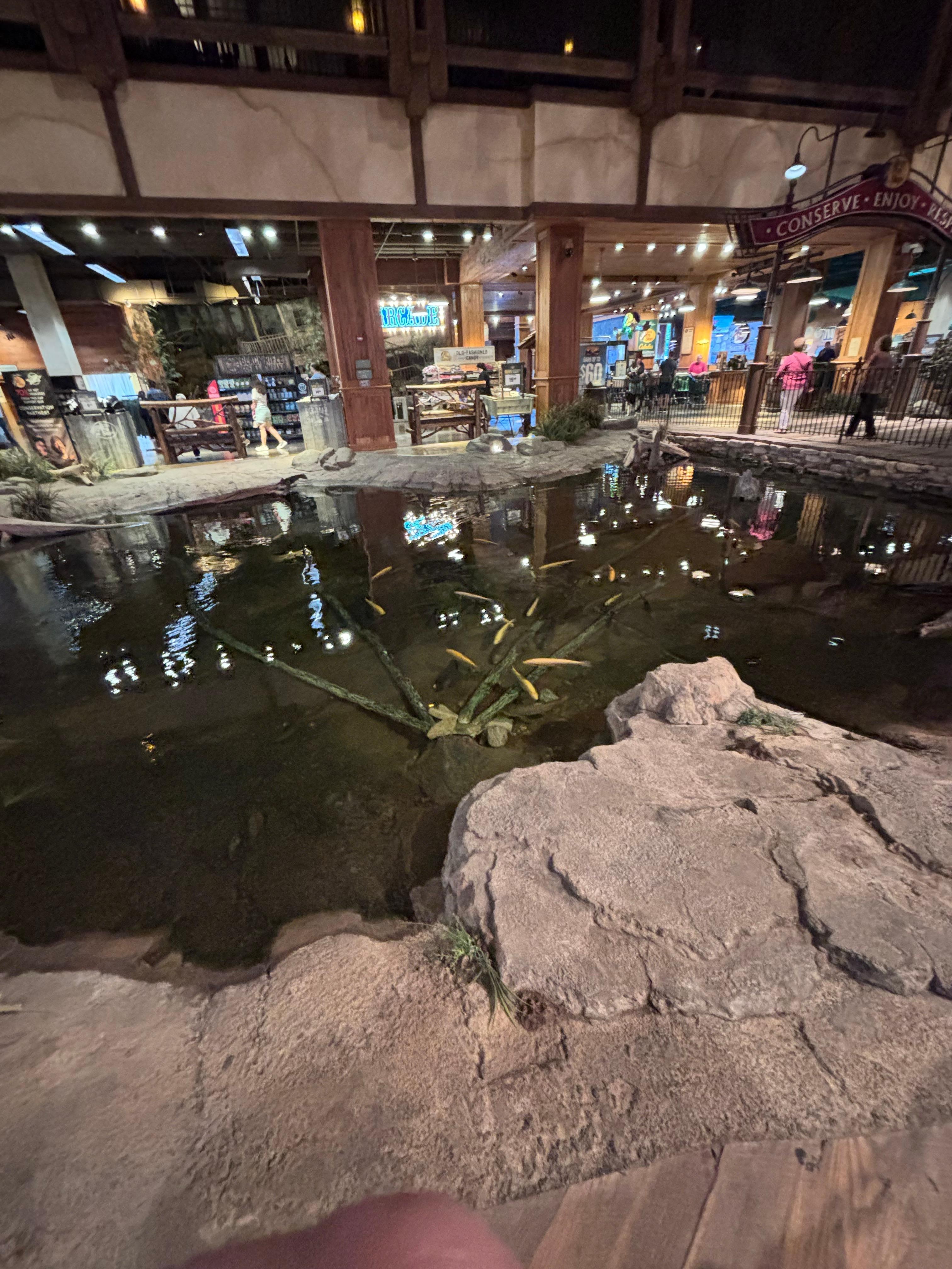 Very cool room inside bass pro. Good detail and decor throughout store and hotel. Fun things for kids to do like bowling, games, scavenger hunt. Service in restaurant at top was nice. Very friendly staff, be patient takes a while for food to come out. Food was terrific. Everyone friendly who worked there.