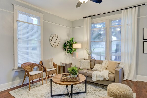 Your stay is a seamless blend of style and functionality. A fully equipped kitchen, a designated dining and work space, a chic living room, and a queen bedroom with luxurious linens offer a cozy retreat. Bask in the natural light streaming through the windows, overlooking the nearby park. For your convenience, we provide a washer and dryer within the unit, along with a pack 'n play for infants and air mattresses for additional guests.