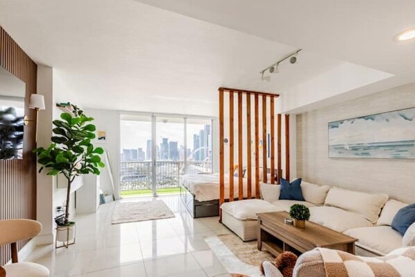 Although this is a studio, the space has been thoughtfully designed for remote workers. The unit features a drop‑top desk with dual monitors and a spacious living area, allowing for both productivity and comfort.