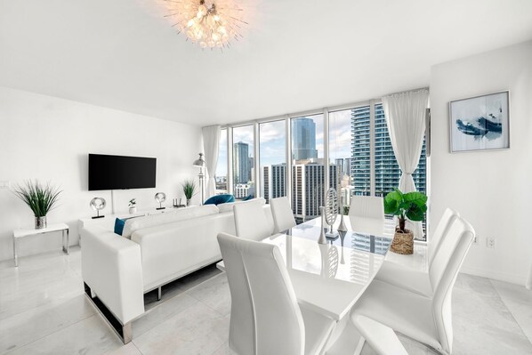 Located in the heart of Brickell, this beautiful apartment is perfect for families, couples, and business travelers alike. With dedicated internet and generous space, it’s also ideal for remote work. The kitchen is fully stocked with cookware, dishes, glasses, cutlery, paper towels, dishwasher soap, and more. You’ll also find convenient appliances like a coffee maker and toaster.