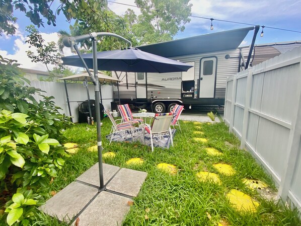 This memorable place is anything but ordinary. This a Glamping needs. You're going to enjoy a different kind of Stay! This is a cozy 1bedroom/1bathroom RV with a private entrance and parking for 2 cars. Perfect for a small family, couples, or solo travelers. You're also going to enjoy a private outdoor dining space/BBQ area fully equiped. We are located within 3.6 miles of the Desing District of Miami, and Midtown; 20 minutes to South Beach; 12 minutes from MIA International Airport.
