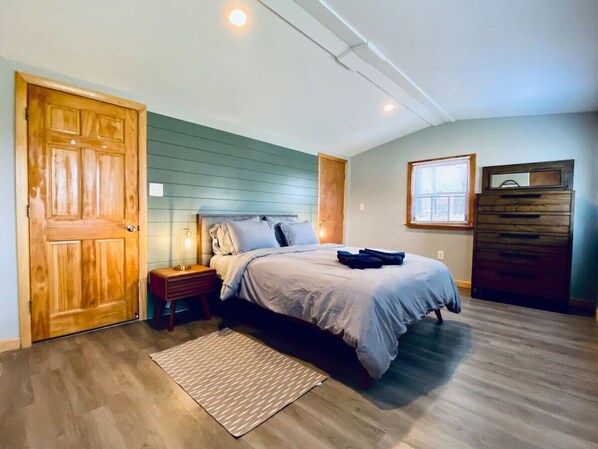 Welcome to our charming Airbnb! On the first floor, you`ll find a cozy bedroom with a queen-size hybrid pillow top bed for a comfortable night`s sleep. The second-floor loft boasts a queen-size memory foam bed for added relaxation. Entertainment is at your fingertips with a 55-inch smart TV equipped with numerous apps for streaming your favorite shows.