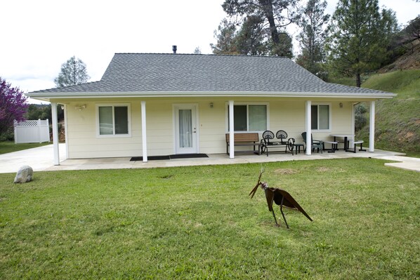 Zu den Außeneinrichtungen gehört ein Propangasgrill. Es gibt auch eine überdachte Veranda mit einem Picknicktisch für Mahlzeiten im Freien und eine herrliche Aussicht auf die umliegenden Ausläufer der Sierra Nevada.