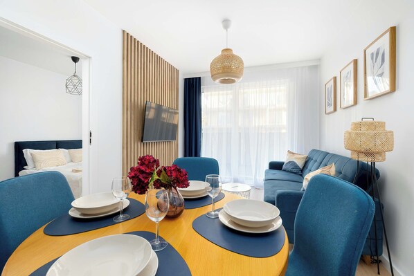 Die Wohnung besticht durch ein harmonisches und ästhetisches Design, das Eleganz mit Gemütlichkeit und Funktionalität verbindet. Helle Farben, sorgfältig ausgewählte Accessoires und ein stimmiges Farbkonzept schaffen eine entspannende und erholsame Atmosphäre. Sorgfältige Verarbeitung und Liebe zum Detail sorgen für ein außergewöhnlich geschmackvolles Gesamterlebnis und laden zum Verweilen in einer angenehmen, wohnlichen Umgebung ein. Der Wohnbereich ist der perfekte Ort, um nach einem Tag am Meer zu entspannen. Ein bequemes Schlafsofa bietet sowohl tagsüber als auch abends Komfort. Von hier aus gelangt man auf eine Terrasse mit Gartenmöbeln – ideal, um den Morgenkaffee im Freien zu genießen oder einen ruhigen Abend ausklingen zu lassen. Die voll ausgestattete Küchenzeile ermöglicht die einfache Zubereitung von Mahlzeiten. Zur Ausstattung gehören ein Induktionskochfeld, ein Backofen, ein Geschirrspüler, eine Kaffeemaschine, ein Kühlschrank mit Gefrierfach, ein Wasserkocher sowie ein komplettes Set an Küchenutensilien und Geschirr. Ein Esstisch mit Stühlen lädt zu gemeinsamen Mahlzeiten in gemütlicher Atmosphäre ein. Das Schlafzimmer wurde mit Blick auf Komfort und Entspannung gestaltet. Es verfügt über ein Doppelbett für einen erholsamen Schlaf und einen geräumigen Kleiderschrank für praktischen und ordentlichen Stauraum während Ihres Aufenthalts. Das Badezimmer besticht durch Ästhetik und Funktionalität. Sorgfältig gestaltet, bietet es alltäglichen Komfort und fördert die Entspannung; es fügt sich harmonisch in die gesamte Wohnung ein.