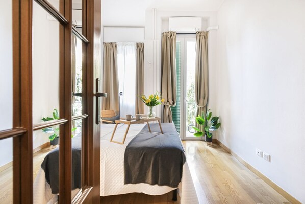 The bathroom, designed with attention to detail, offers a spacious walk-in glass shower that adds a touch of style to the environment. The sleeping area includes a bright double bedroom with direct access to a private balcony, ideal for moments of relaxation in the open air.