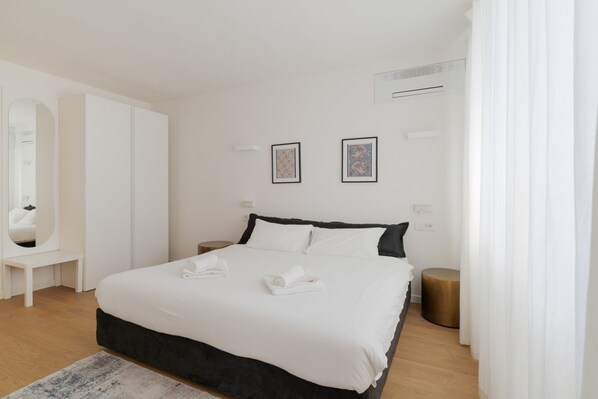- BEDROOM with double bed, bedside tables, wardrobe, mirror, split air conditioning;