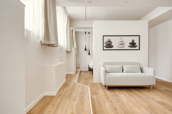 Discover a bright, minimalist apartment where every detail is designed for comfort. The space opens onto a modern living area with a sofa bed, TV, and large windows that let in plenty of natural light. The kitchen is fully equipped with an induction cooktop, coffee machine, kettle, and all the utensils needed to cook at home.