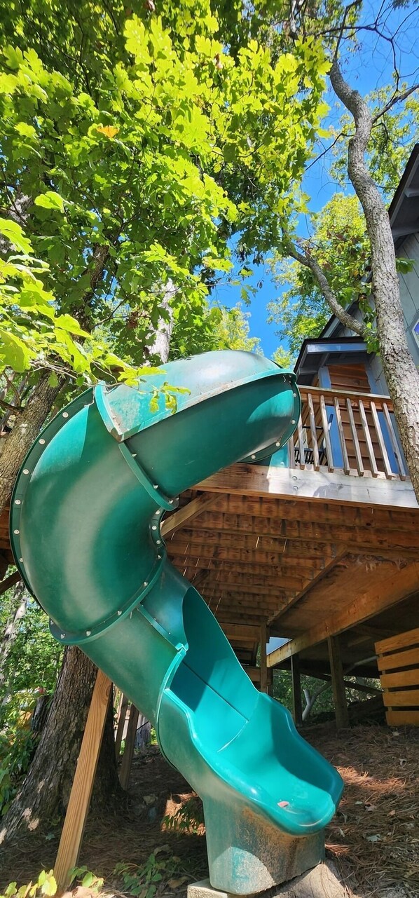 2-story treehouse with a cargo net connecting the upstairs lofts, a large balcony with a slide to the ground level, sleeps 10.