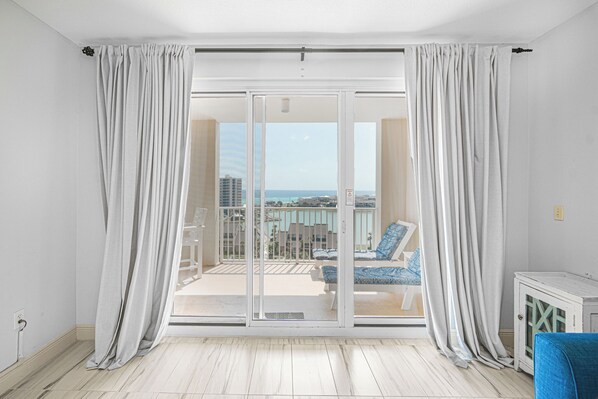 Enjoy all the amenities of the beautiful Seascape Resort and amazing views from this 9yhth floor modern condo at Ariel Dunes2! With views of the Choctawhatchee Bay and 18-hole golf course from the front door and spectacular views of the Emerald Coast and Stewart Lake from the back door you may never want to leave. This newly remodeled 3 bedroom, 2 bath condo has it all and is perfect for the kids to have their own space. This spacious floor plan has 9-foot tall ceilings with 8-foot tall sliding glass doors for ocean views from both the living room and master suite. This ninth floor condo (909), in Ariel Dunes II, features one of the best views in the building with miles of pristine beach on full display from the balcony! A very short walk to a private beach and you will be relaxing in the sand. This condo sleeps 8 with a master bedroom, guest bedroom with extra bunk room, and a pull-out sofa in the living room. There are LCD TVs in the master bedroom, guest bedroom and living room. Condo comes with in unit washer/dryer, wifi, cable TV, and fitness room access. Guests booking through our website also have the option for Pack' N play rental.
