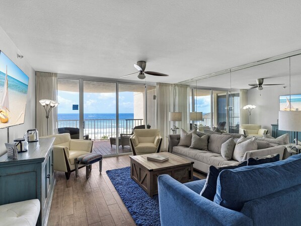 Diese Destin Beach Wohnung in Gulfside ist mehr als nur ein paar schön eingerichtete Zimmer - es ist ein friedlicher Zufluchtsort, in dem sich die Probleme in der beruhigenden Golfbrise zerstreuen. Direkt an den weißen Ufern der glitzernden smaragdgrünen Küste gelegen, erfüllen die Geräusche und Sehenswürdigkeiten des Strandes die gesamte Ferienwohnung mit einem beruhigenden Ambiente. In der Tat haben die jüngsten Verbesserungen wie ein frisches Dekor in Strandtönen, neuen Geräten und Möbeln nur zu der glückseligen Luft an der Golffront beigetragen, die Gulfside 402 bietet. Neben einer ausgezeichneten Lage im vierten Stock mit Blick auf den Strand bietet Gulfside 402 auch andere Vorteile im Inneren. Flachbildfernseher im gesamten Gebäude, Restaurants für 10 Personen und ein möblierter Gulfront-Balkon lassen nichts für einen großartigen Strandurlaub fehlen. Plus, die Annehmlichkeiten, die Hidden Dunes bietet, sind einfach fantastisch! Mehrere Pool- und Spa-Decks, Rubico-Tennisplätze mit einem kompletten Tennisladen, Basketball- und Hufeisenplätze, Wanderwege rund um die bewaldete Fläche und der längste Abschnitt mit Zugang zum Strand in der Umgebung sind Teil des Hidden Dunes-Appells. Gleich hinter den Toren von Hidden Dunes befinden sich Silver Sands Premium Outlets, Lebensmittelgeschäfte, Restaurants und vieles mehr.