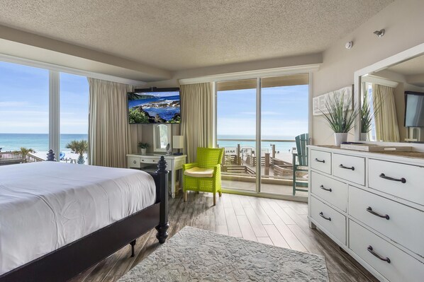 Das Schlafzimmer verfügt über ein Kingsize-Bett, einen an der Wand montierten Flachbildfernseher und einen spektakulären Blick auf das Pooldeck und den Strand. Das Badezimmer befindet sich direkt neben dem Schlafzimmer und verfügt über eine Kombination aus Dusche und Badewanne.