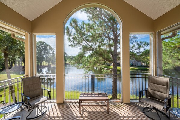 The heart of the home is a bright and spacious living area designed with connection in mind and the chef-style kitchen is outfitted with stainless-steel appliances and granite countertops, fully equipped for everything from beachside brunches to sunset seafood dinners. Gather around the dining table, then move into the cozy living room or step outside onto the screened-in back porch—a true hidden gem of this home. Overlooking the lake and surrounded by lush greenery, this outdoor space offers covered comfort, inviting lounge seating, and stunning views of the water and golden hour skies.