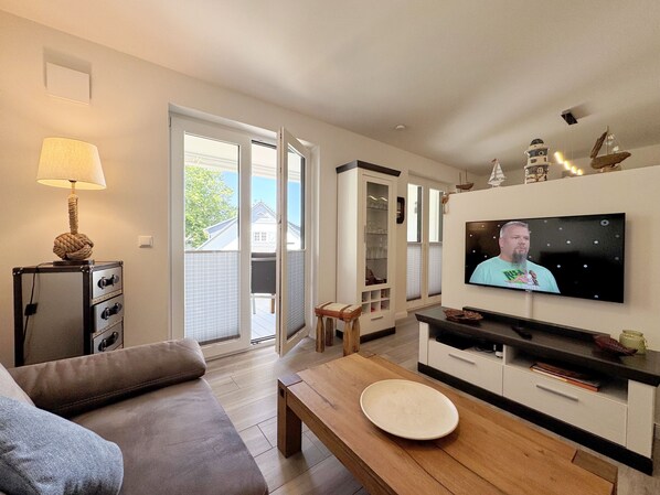 Das komfortable, stilvoll und modern eingerichtete 3-Zimmer-Appartment Sturmböe in der 1. Etage besticht durch seine unvergleichliche Strandnähe und das nordische Flair. Auf ca. 70 m² ist diese Allergiker gerechte Nichtraucherwohnung mit viel Liebe zum Detail eingerichtet und für max. 2 bis 4 Erwachsene + 1 Kleinkind bis Jahre im Kinderreisebett optimal nutzbar. Die Räumlichkeiten sind mit einer Fußbodenheizung, Fensterläden und Insektenschutzgittern versehen. Die hochwertig eingerichtete Einbauküche befindet sich im kombinierten Koch-Ess-/Wohnbereich einschließlich Kühlschrank und Gefrierfach, Geschirrspüler, Induktionsherd mit Backofen, Kaffeemaschine, Tassimo Padmaschine, Mikrowelle, Wasserkocher, Eierkocher, Toaster, diverser Küchenutensilien sowie einem Esstisch. Der offene Wohnbereich verfügt über eine moderne Couch, Couchtisch, Leselampe, Smart-TV mit Satellitenanschluss, Blu-Ray Player und Micro-Hi-Fi System mit Bluetooth und CD/USB/DAB-Radio. Auch auf einen Internetanschluss (WLAN) müssen Sie im Urlaub nicht verzichten. Dieser ist für Sie inklusive! Eine kleine Auswahl an Urlaubslektüre und Gesellschaftsspielen sorgt für eine gelungene Abwechslung. Auf dem großen, überdachten und bestuhlten 12 m²-Balkon (Süd/West) mit Sonnenschirm, können Sie den Abend bei einem Glas Wein ausklingen lassen und den wunderbaren Blick ins Grüne genießen. Eine elektrische Markise rundet den Komfort ab. Für erholsamen Schlaf finden Sie in beiden Schlafzimmern ein bequemes Doppelbett (mit je 1,80 m x 2,00 m), Nachttischablagen sowie einen Kleiderschrank. Auch an eine Verdunklung und Insektenschutzgitter wurde gedacht. Ein Flachbild-TV für sorgt in einem Schlafzimmer zusätzlich an Komfort. Ein Kinderreisebett und ein Kinderhochstuhl sind vorhanden und unentgeltlich nutzbar. Das Appartement verfügt über ein modernes Badezimmer mit Waschplatz, ebenerdiger Glasdusche, WC, Fön, Kosmetikspiegel und Handtuchtrockner sowie zusätzlich über ein separates Gäste-WC mit Waschbecken. Ein zum Appartement gehörender PKW-Stellplatz (Nr. 8) befindet sich hinter dem Haus. Ihre mitgebrachten oder geliehenen Fahrräder können Sie in Ihrem persönlichen Abstellraum unterbringen und sogar E-Bikes aufladen. Haustiere sind nicht erlaubt. Die Erstausstattung eines Wäschepaketes (komplette Bettwäsche, 1 Duschhandtuch, 2 kleine Handtücher) können Sie bis 14 Tage vor Anreise gegen einen Aufpreis dazu buchen oder durch eigene ergänzen. Ab 2 gebuchten Paketen erhalten Sie einmalig 1 Geschirrhandtuch und 1 Duschvorleger hinzu. Wir wünschen Ihnen einen traumhaften Urlaub an der Ostsee, erholen Sie sich gut und genießen Sie die Zeit.