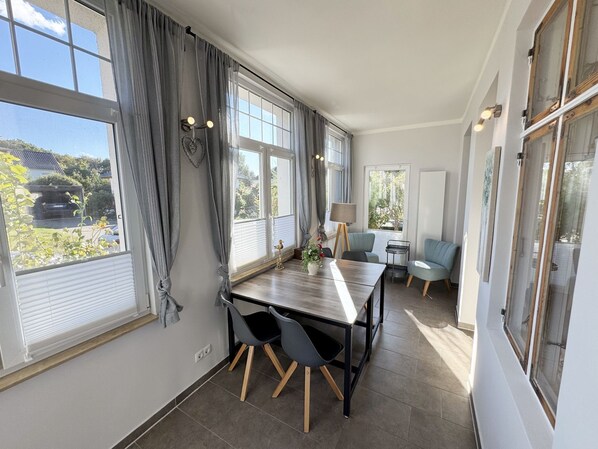 Unsere Ferienwohnung 2 Rosengarten ist eine komfortable ca. 70 m² große Nichtraucherwohnung im Erdgeschoß des Hauses Seestern. Hier finden Sie für Ihre Familie, max. 5 Erwachsene und 1 Kleinkind bis 3 Jahre im Kinderreisebett, für einen angenehmen Urlaub ausreichend Platz, viel Bequemlichkeit und Komfort. Sie werden sich einfach WOHLFÜHLEN! In der modernen und voll ausgestatteten Küche können Sie gemeinsam Ihr Essen zubereiten. Alles was Sie brauchen steht zur Verfügung Herd mit Ceranfeld, Backofen, Geschirrspüler, Mikrowelle, Kühlschrank mit Gefrierfach, ausreichend Stauraum und natürlich auch ein Wasserkocher, Toaster, Kaffeemaschine und diverse Küchenutensilien. Auf der vorgesetzten Veranda, die als Esszimmer eingerichtet wurde, können Sie die Mahlzeiten gemeinsam einnehmen und verweilen. Von dort kommen Sie auch direkt zu Ihrer eigenen und bestuhlten Terrasse (Südost) mit kleinen Rosengarten, der nur dieser Wohnung zur Verfügung steht. Zusätzlich können Sie aber auch den gemeinschaftlichen Garten nutzen, den Sie auch von der Veranda aus direkt oder über den Hof erreichen können. Im Wohnzimmer mit Flachbild-TV und Radio mit Bluetooth finden Sie einen gemütlichen Couchbereich zum Ausruhen (Aufbettungsmöglichkeit für 5. Person - 1,40m x 2,00m), einen Couchtisch, einen Lesesessel, Leselampe sowie ein Sideboard runden den Bereich ab. Auch auf einen Internetanschluss (WLAN) müssen Sie im Urlaub nicht verzichten. Dieser ist inklusive für Sie. Das geräumige Schlafzimmer mit Boxspringbett (1,80 m x 2,00 m) und großen Kleiderschrank bietet zudem bei Bedarf noch Platz für ein Kinderreisebett für Ihr kleinstes Familienmitglied. Hier haben wir die beiden historischen Fenster anhand eines Fotos aus alter Zeit nachbauen lassen können. Hier schließt sich eine Veranda an: das 2. Schlafzimmer mit einem Kojenbett (2x 0,80 m x 2,00 m), welches auch mit Flachbild-TV voll eingerichtet wurde. Wenn die Abende kühler werden, können Sie sich in der wohnungseigenen Sauna aufwärmen und erholen. Das Bad mit Sauna wurde als Duschbad mit WC, Fön und Handtuchheizkörper ausgestattet und im separaten Vorraum, mit dem historischen Dielenboden und einer Wand in Steinoptik, findet man den großen Waschtisch, Spiegel und auch Ablagemöglichkeiten. Im Wohn-, Schlafzimmer, in der Küche und im Vorraum zum Bad konnten wir den alten Holzfußboden erhalten und haben diesen aufarbeiten lassen. In den anderen Räumen haben wir hochwertige Fliesen oder ein anderes passendes Material ausgelegt. Insektenschutzgitter und Verdunklungsmöglichkeiten sind vorhanden. Für unsere kleinen Gäste stehen je 1 Kinderreisebett (ohne Zusatzmatratze / ohne Bettinlett) und 1 Hochstuhl pro Wohnung inklusive zur Verfügung. Ihr PKW-Stellplatz (Nr. 2) befindet sich auf dem Grundstück sowie ein Gemeinschaftsgrill. 2 Haustiere sind gegen eine Gebühr willkommen. Eine Waschmaschine und ein Trockner stehen allen Gästen gegen Gebühr zur Verfügung. Diese Räumlichkeiten befinden sich auf der Hofseite. Die Erstausstattung eines Wäschepaketes (komplette Bettwäsche, 1 Duschhandtuch, 2 kleine Handtücher) können Sie bis 14 Tage vor Anreise gegen einen Aufpreis dazu buchen oder durch eigene ergänzen. Ab 2 gebuchten Paketen erhalten Sie einmalig 1 Geschirrhandtuch und 1 Duschvorleger hinzu.