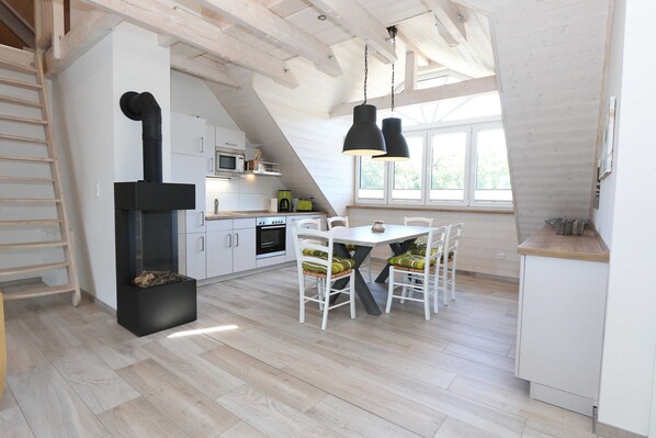 Die im nordischen Stil eingerichtete Nichtraucherwohnung mit 89 m² findet sich in der 2. Etage. Sie ist lichtdurchflutet und geprägt durch Holzschrägen, dicke naturbelassene Holzbalken, die einen Blick in den First zulassen. Die Ferienwohnung „Seestern“ ist für max. 6 Erwachsene und 1 Kleinkind bis 3 Jahre im Kinderreisebett bestens geeignet. Sie ist modern eingerichtet mit einem großen Ledersofa, Leselampe, 2 Relax-Sessel und einem Lowboard mit Smart-TV, Soundanlage, Blue Ray-Player und Radio mit CD-Player. Auch im Urlaub brauchen Sie auf einen Internetanschluss (WLAN) nicht verzichten. Dieser ist für Sie inklusive. An kühleren Tagen sorgt ein Gaskamin für angenehme Wärme. Vom Wohnbereich gelangen Sie auf den großen und bestuhlten Balkon (Süd) mit Sonnenschirm, auf dem Sie bei einem gemütlichen Frühstück Ihren Urlaubstag in Ruhe beginnen können. Bei der offenen Einbauküche müssen Sie auf nichts verzichten. Vom Geschirrspüler, Backofen, 4-Zonen-Cerankochfeld, Kühlschrank mit Gefrierkombination, Mikrowelle, Kaffeemaschine, Toaster, Wasserkocher bis hin zu vielen Küchenhelfern. Vom großen Esstisch, an dem 6 Personen Platz finden, genießen Sie einen Blick in ein Wäldchen, hinter welchem sich die Ostsee befindet. 2 Schlafzimmer verfügen über eingebaute Kleiderschränke sowie je ein Doppelbett (1,80 m x 2,00 m) mit Nachttischablagen, welche für Entspannung sorgen und erholt in den nächsten Urlaubstag schlafen lassen. An ein Schlafzimmer schließt sich ein En Suite Tageslichtbad mit WC, Waschplatz, Kosmetikspiegel, Fön und Dusche an. Das größere Tageslichtbad mit Infrarotsauna verfügt unter anderem auch über einen Wasch- und Trockenautomat, WC, Waschtisch, Fön sowie eine Dusche. Ein weiteres Highlight ist ein offener, durch ein Geländer abgegrenzter Schlafboden im Gebälk (Höhe 1,52 m), der über eine Raumspartreppe aus dem Wohnbereich erreicht wird. Dort befinden sich zwei große Einzelbetten (0,90 m x 2,00 m). Insektenschutzgitter sind vorhanden. In der Zeit vom 01. Juni - 31. August sind der Kamin und die Sauna nicht zu nutzen! Für unsere kleinen Gäste stehen 1x Kinderreisebett (ohne Zusatzmatratze, ohne Bettinlett) sowie 1x Hochstuhl (ohne Gurt) inklusive zur Verfügung. Im abschließbaren Nebengebäude können Sie Ihre Fahrräder sicher unterstellen. Ihren PKW können Sie auf dem zur Wohnung gehörenden Stellplatz (Nr. 9) direkt am Haus abstellen. Ein Grillplatz für alle Hausgäste ist vorhanden. Haustiere sind leider nicht erlaubt. Die Erstausstattung eines Wäschepaketes (komplette Bettwäsche, 1 Duschhandtuch, 2 kleine Handtücher) können Sie bis 14 Tage vor Anreise gegen einen Aufpreis dazu buchen oder durch eigene ergänzen. Ab 2 gebuchten Paketen erhalten Sie einmalig 1 Geschirrhandtuch und 1 Duschvorleger hinzu.