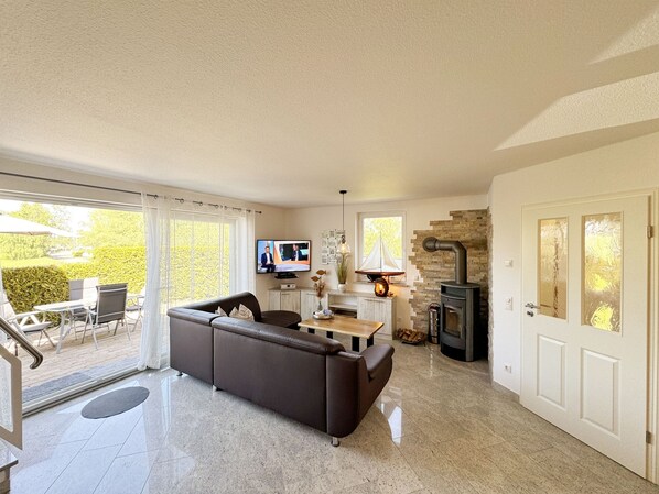 Die Doppelhaushälfte Meeresbrise ist mit Ihren ca. 75 m² großzügig geschnitten und bietet ausreichend Platz für bis zu 5 Personen. Die Unterkunft (Nichtraucher) ist auf 2 Ebenen verteilt und verfügt zusätzlich über eine Terrasse mit Bestuhlung, Sonnenschirm, Strandkorb und einem Weber Kugelgrill. Im Erdgeschoss verfügt die Doppelhaushälfte Meeresbrise über einen großen Wohn/Essbereich mit einem Esstisch für 5 Personen, eine gemütliche Couch, Smart-TV mit Sky (Auswahl von Sport, Film, Dokumentation), Blu-Ray-Player, DAB-Radio und direkten Zugang über die Schiebetür auf die Terrasse. Auch im Urlaub müssen Sie nicht auf einen Internetanschluss (WLAN) verzichten. Die in dem Wohnbereich integrierte Küchenzeile verfügt über einen Backofen mit Umluft, Ceranfeld, Mikrowelle, Kühlschrank mit Gefrierfach, Geschirrspüler, Spüle, Kaffeemaschine, Toaster, Wasserkocher, Eierkocher, Brotschneidemaschine, Bosch Tassimo Maschine, Heißluftfriteuse und weitere diverse Küchenutensilien. Für die kältere Jahreszeit sorgt ein Kaminofen für gemütliche Abende. Ein Gäste-WC befindet sich im Erdgeschoss. Über die Treppe erreichen Sie das Obergeschoss, wo sich 2 Schlafzimmer, ein Duschbad und ein Wirtschaftsraum mit Waschtrockner, Bügelbrett und Bügeleisen befinden. Das 1. Schlafzimmer verfügt über ein Doppelbett (1,80m x 2,00m), Smart-TV, Kleiderschrank & Kommode sowie einen Relax-Sessel. Das 2. Schlafzimmer ist mit einem Einzelbett (0,90m x 2,00m), einem Tandembett (Einzelbett mit Ausziehfunktion je 0,90m x 2,00m), Flachbild-TV, einer Kommode und einem Kleiderschrank ausgestattet. Das großzügig gestaltete Bad verfügt über eine Glasrunddusche, Handtuchtrockner, Waschtisch, Spiegelschrank, Fön und WC. Das gesamte Haus ist mit einer Fußbodenheizung ausgestattet und mit Granit (außer die Schlafzimmer) gefliest. Alle Fenster können durch elektrische Außenrollos abgedunkelt werden, rundherum sind Insektenschutzgitter installiert. Ein PKW-Stellplatz befindet sich direkt am Haus sowie eine Ladestation für Elektrofahrzeuge (kostenpflichtig). Die überdachte Fahrradunterstellmöglichkeit für max. 4 Fahrräder befindet sich am Gartenhaus. Auf der Wiese ist eine Wäschespinne für Sie aufgestellt. Von der Terrasse mit Strandkorb aus, können Sie den Tag bei einem Gläschen ausklingen lassen und wunderschöne Sonnenuntergänge in Richtung Hafen genießen. An kühleren Tagen steht Ihnen eine neue Fasssauna zur Verfügung. Für unsere kleinen Gästen stehen 1 Kinderbett sowie 1 Hochstuhl inklusive zur Verfügung. Auf dem eingezäunten Grundstück sind max. 2 Haustiere (kniehoch, keine Katzen) gegen eine Extragebühr erlaubt. Die Erstausstattung eines Wäschepaketes (komplette Bettwäsche, 1 Duschhandtuch, 1 kleines Handtuch) können Sie bis 14 Tage vor Anreise gegen einen Aufpreis dazu buchen oder durch Eigenes ergänzen. Ab 2 gebuchten Paketen erhalten Sie einmalig 1 Geschirrhandtuch und 1 Duschvorleger hinzu.