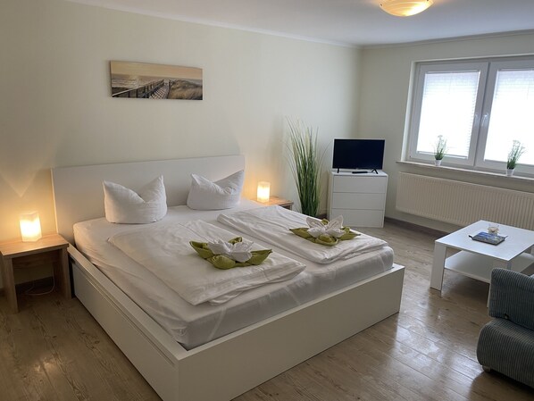 In jeder Ferienwohnung wurden 2021 neue Möbel für den Wohn- und Schlafbereich gekauft und alle Räume wurden renoviert. Im Wohnbereich finden Sie u.a. eine Sitzgruppe für einen gemütlichen Abend eine Couch und einen Flachbild-TV. Das Schlafzimmer verfügt über ein Doppelbett mit jeweils zwei Nachttischen, einem Kleiderschrank und einer Kommode.