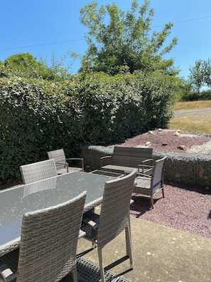 Direkt auf der vorderen Terrasse können Sie im Freien speisen, um die schönen Sommertage zu verbringen. Barbecue und ein großer Holztisch und Stühle.