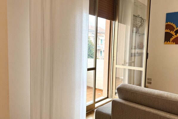 Description: three-room apartment on the first floor. Entrance with kitchenette with dishwasher - living area with sofa and single sofa bed - double bedroom - second bedroom with two single beds - bathroom with tub and shower - terrace and small garden. Reserved parking space. Pets allowed.