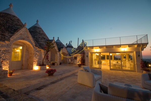 A stunning villa complex consisting of six Trulli cones older than 100 years; fully renovated trulli ( traditional Apulian architecture ) and a large modern and fully equipped living area. This magnific villa includes a large private sail-shaped swimming pool with hydromassage jets in a part surrounded by a beautiful lawn and a shaded pergola for comfortable lounging and relaxing. Between the pool area and the villa there is a wide pergola with a wooden table and seating for 20 along with an outdoor yakitori barbecue and sink . The setting around is amidst olive orchards , apricot, pomegranate , fig and almond trees ; it boasts a panoramic position dominating the countryside all around.
