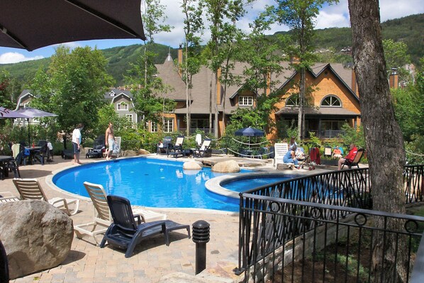 Die Gäste im Sommer genießen freien Zugang zu einer Vielzahl von Les Manoirs Annehmlichkeiten. Ein Drei-Minuten-Spaziergang führt Sie zu einem wunderschön gepflegten Drei-Ebenen-beheizten Außenpool und 12-Personen-Jacuzzi (geöffnet von Ende Juni bis Anfang September). Es gibt auch ein Baumhaus für Kinder, ein kleiner Spielplatz und eine rustikale Aussichtsplattform, die zum Sitzen unter den Sternen perfekt ist. Es gibt Radwege, Fußgängerwege und Wanderwege in der gesamten Region. Die Gäste im Juli und August auch den freien Zugang zu einem privaten Sandstrand und Picknickplatz am Lac Tremblant, nur wenige Minuten vom Hotel entfernt.