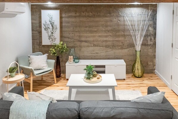 L'appartement est situé dans un joli quartier, avec un supermarché à proximité, le parc olympique très vite accessible, une ligne de bus et le métro Viau qui permettent de se déplacer facilement. Il est très propre avec de l'électroménager moderne et complet. Il faut partager la laveuse sécheuse avec les autres appartements et il n'est pas toujours facile d'avoir un créneau.Nous passions la journée hors de l'appartement, en visites et chez nos enfants ce qui nous a permis de ne pas être trop gênés par la situation en sous sol. On a l'impression d'être très enfermés. Tout était parfait au niveau de l'appartement lui même, pour un couple c'est très bien cependant l'ensemble des condos étant loués de façon temporaire, on ne sait pas à l'avance comment se comporteront les locataires du dessus. Pour nous ce fut très pénible d'être réveillés à 4h du matin par des gens qui rentrent peut être de soirée, ou de ne pas pouvoir s'endormir tellement ils faisaient du bruit (galopades dans l'escalier, pas avec chaussures sur le parquet, voix, musique, douches etc....) C'est sans doute un problème d'isolation mais c'est le gros inconvénient de l'appartement en sous sol.