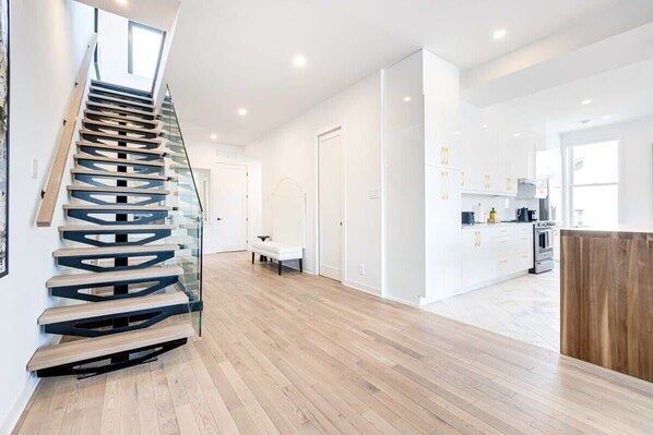 The first floor boasts a spacious living area, elegant dining room, three bedrooms, two and a half bathrooms, and a gourmet kitchen with top-of-the-line appliances. The second floor is a private retreat, with one generously sized bedroom, and one bathroom.