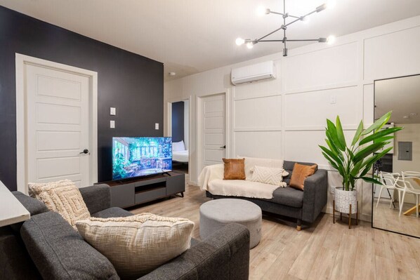- Stylish open-concept living space with Smart HD TV and comfy sofas