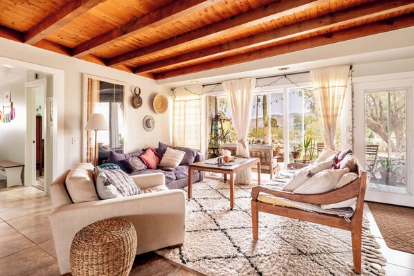 LIVING ROOM & KITCHEN: Colorful, lively artwork / exposed beam ceilings / fully equipped / large countertop space.