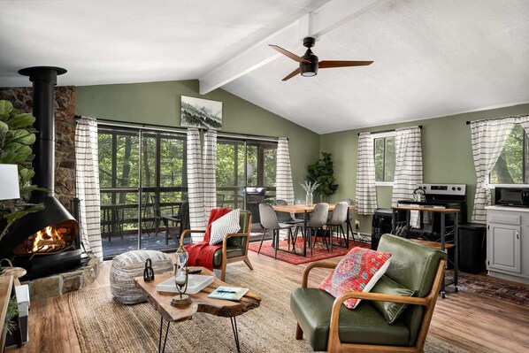 - Wood-burning stove to keep you cozy on those cool winter nights (we also have electric heat and AC to keep you comfortable!)