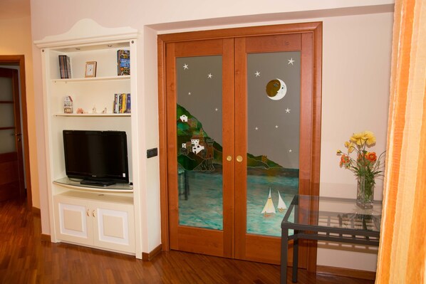 The Soleluna appartment is a very beautiful and cozy place. The hosts Gennaro and Gianpaolo were very nice and friendly. They took good care of us. We stayed there for one week with seven persons (4 adults and three children). We had enough place in one main room for 3 persons and bathroom en suite, one side room with two single beds and a sofa-bed for two persons in the living room. The appartment has two spacious bathrooms, a washing machine and a kitchen with oven, stove, microwave, dishwasher and refrigerator. The kitchen is well iluminated and spacious. It has wordeful vitrals and the dinning table is also in the kitchen. The appartment is very well located. You can reach the scavations in 5 minutes by foot. Nearby there are plenty of shops and restaurants. We highly recommend this place. srefrigeratormachine, anbathrod a spacious kitc hen