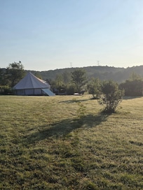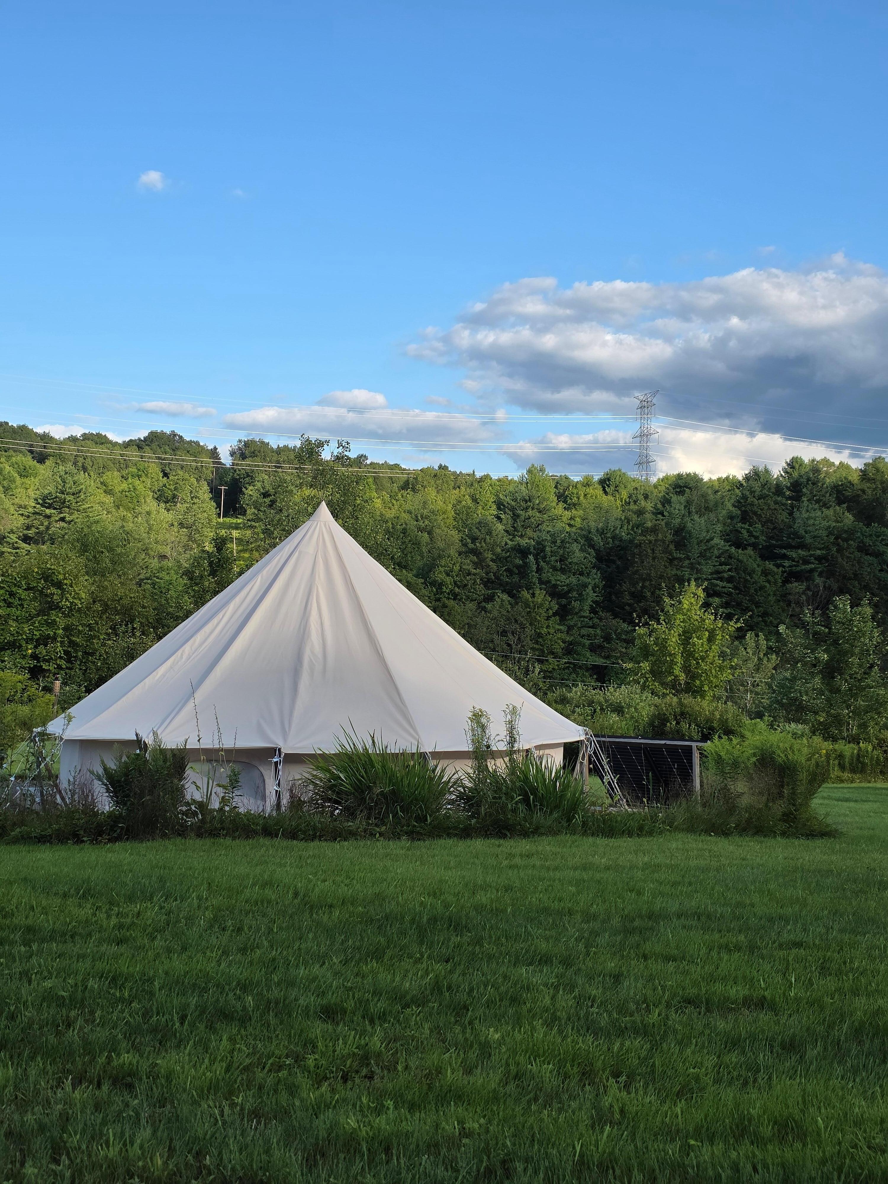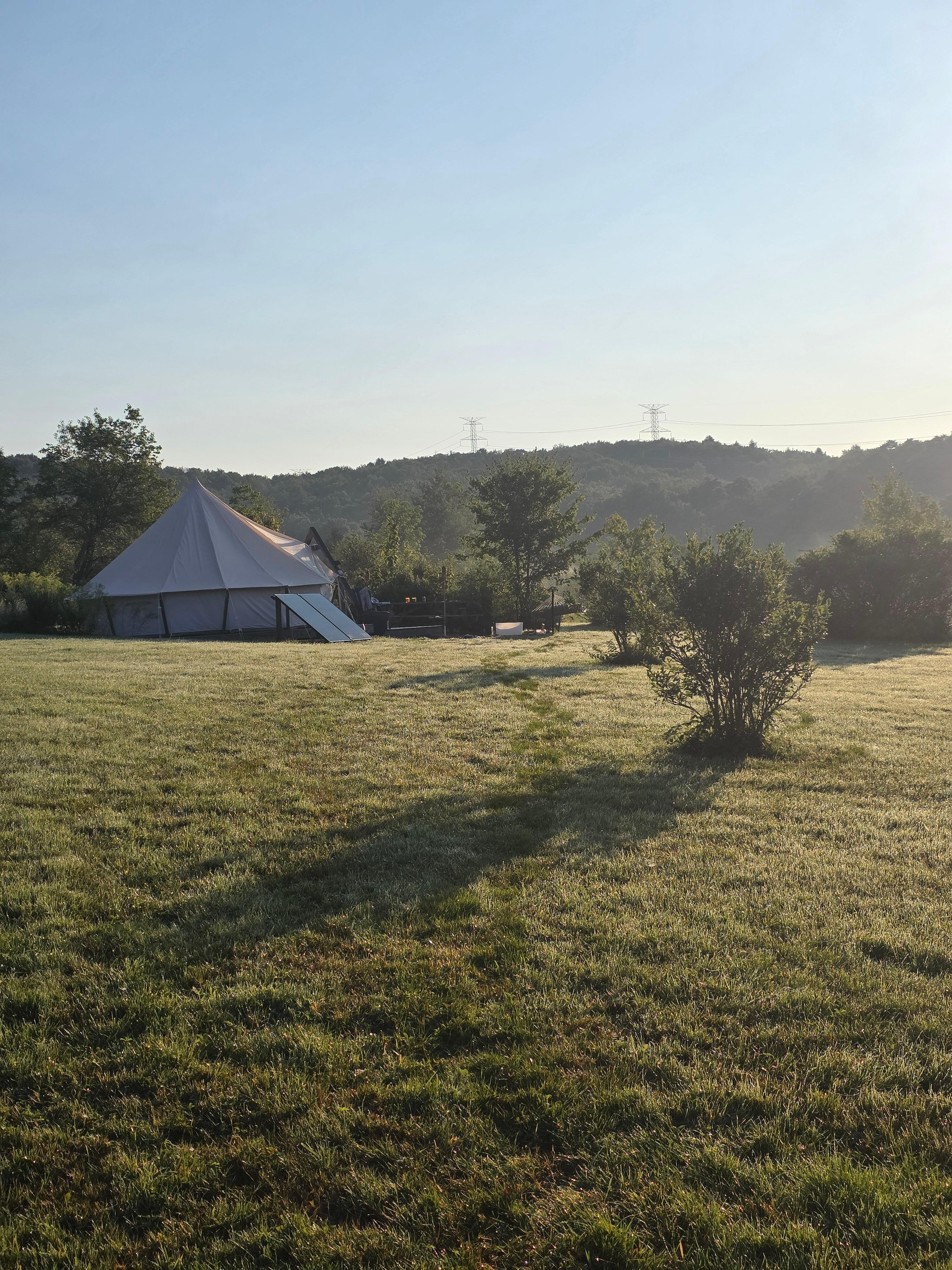 The grounds are a nicely manicured hillside cleared out from the surrounding forrest. Patches of garden dot the area breaking up sight lines and keeping the feeling of wilderness strong, even with a bathhouse, campstore, and tents all near by. Many of the patches of garden are blueberry bushes which we were encouraged to harvest from as we wished. (I ate a LOT of berries.) The accomodations in our tent were fantastic. Power was available in outlet and USB, as well as a wireless charger on the nightstand. There were also all of the standard bnb style amenities (cups, dishes, untensiles, towels, toiletries, etc...) and a very comfortable queen size bed. It was like a nice hotel room stuffed into an adorable tent.I generally wouldn't call out an included breakfast (because they are usually pretty underwhelming) but the spread here was noteworthy. It was all serve yourself with a toaster, waffle maker, and omelet cooker available, but the variety was fantastic. There were cereal, bread, and egg options, a variety of granola bars, pop tarts, and breakfast snacks, and lots of fresh fruit. The soaking tubs were well worth booking just on their own. It was incredible soaking, relaxing by the fire, and stargazing all at the same time!I have to praise Chrissy and fam for being such great hosts. They managed to hit that perfect balance of providing everything we needed while not being around to interrupt our privacy.A property. Will 100% be visiting again.