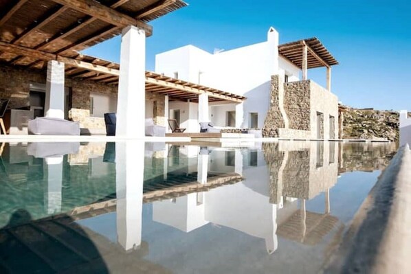 Amazing outdoor space with sea/sunset view with private infinity pool, fully equipped outdoor kitchen, lounge & dining area, loungers, full privacy.