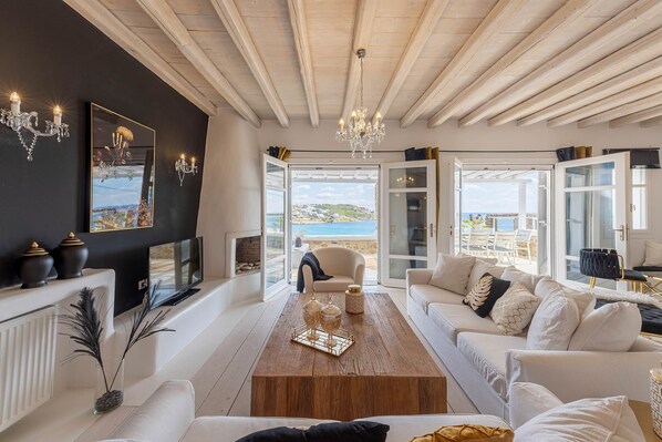 Seaside Villa is a sea front villa with 5 bedrooms and 5 bathrooms and it is within walking distance to one of the most beautiful beaches of the island Kalo Livadi which is famous for its golden sand. It is fully organized and is home to the famous beach bars Lohan and Solymar.