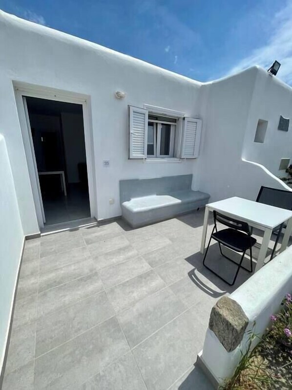 Summary: Two-room apartment for 4 people, with 2 bedrooms, a bathroom and private outdoor terrace, located in the Vrysi area, about 800 m away from the chora.