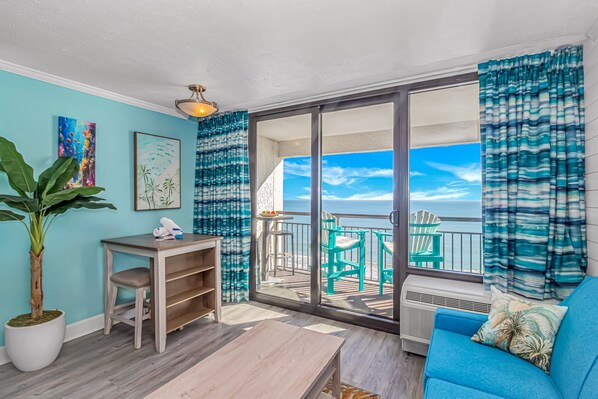 At the heart of the condo is a space designed for pure relaxation. Unwind on the king sized bed or stretch out on the new sleeper sofa while enjoying the sleek rock accent wall, a mounted flat screen TV, and an ambient LED fireplace that adds a cozy glow to the room. A small table and chairs provide the perfect spot for meals, games, or planning the next day's adventures. Floor to ceiling glass doors lead directly to the balcony, filling the space with natural light and framing the ocean views that make this condo so special.