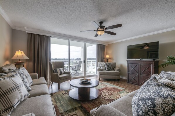 Möchten Sie die Boote beobachten oder das Feuerwerk von Ihrem Balkon aus beobachten? Diese Eigenschaft hat die perfekte Aussicht, um alle Aktionen auf dem Wasserweg und Barfuß Landing zu erleben. Im Jahr 2019 komplett renoviert, mit neuen Böden, neuen Betten, neuer Küche und neuen Geräten. Alle Zimmer wurden frisch gestrichen. Diese komfortable und geräumige Wohnung verfügt über eine große neue Küche mit einer Frühstücksbar mit Blick auf den Ess- und Wohnbereich. Es gibt 2 Königinnen im Hauptschlafzimmer, einen König im 2. Schlafzimmer und 2 Königinnen im 3. Schlafzimmer. Alle Schlafzimmer haben ein eigenes Badezimmer. Das Wohnzimmer ist sehr ger��umig und verfügt über einen großen Flachbildfernseher. Außerdem gibt es in allen Schlafzimmern neue Fernseher.