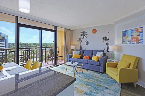 Welcome to your colorful coastal retreat in the heart of Myrtle Beach. This sun-soaked corner suite is where comfort meets fun — perfect for families, couples, or friends looking for a relaxing getaway with style.