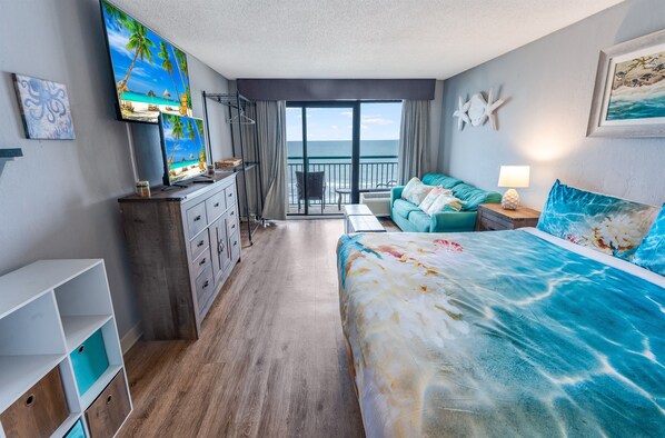 Sandcastle South 709 at Big Fish Rentals. What a stunning view from your private balcony! This DIRECT oceanfront condo boasts 1 King Bed, 1 Queen Sleeper Sofa, and 1 full private bathroom, not to mention breathtaking views from the balcony and access to resort-style amenities. Newly updated, this condo is perfect for accommodating 4 guests and makes an ideal choice for your next Myrtle Beach getaway.