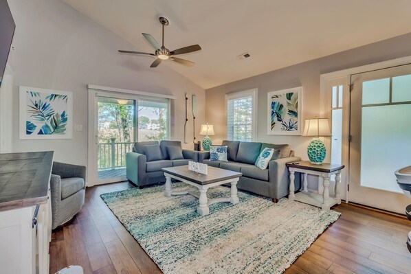 - large living room with 75" tv and sleeper sofa