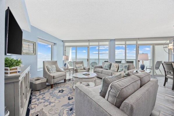 If relaxation is what you are looking for, dive into your choice of beach-side outdoor and indoor hot tubs or grab a tube and drift away into tranquility in one of two 225’ lazy rivers. Once inside the condo, there is plenty of room for families, couples and golfing buddies. You’ll find a spacious living room and balcony, perfect for viewing the endless Myrtle Beach coastline. Each bedroom in this roomy condo includes Smart TVs and their own bathrooms. The fully stocked kitchen invites culinary adventures with plenty of dining space. Don’t wait, book today!