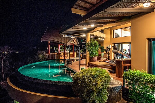 The main house offers three luxury bedrooms with main floor entry leading to a grand living and dining area. It boasts marble flooring, custom artworks, an infinity swimming pool and adjacent hot tub - both overlooking the Pacific Ocean. A professional chef makes use of a full kitchen and exterior BBQ terrace to service your every order. Whether dining or lounging indoors or outdoors, the villa's multiple TVs and sound systems ensure you will be entertained. The best entertainment, however, is Casa Rosen's prime sunset view over the Pacific Ocean.