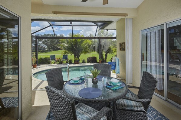 Der Speisesaal bietet Platz für 6 Personen am Tisch und zusätzliche Barhocker an der Frühstücksbar. Sowohl das Wohnzimmer als auch das Esszimmer bieten Blick auf den Pool, den Whirlpool und den Golfplatz.