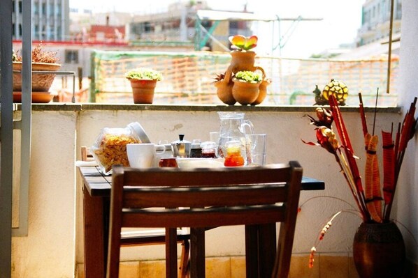 da evitare per famiglie, e' vero che la posizione e' centrale ma e' anche vero che e' posto al 5 (terrazza a proposito si vedono non i tetti ma le antenne dei tetti) senza ascensore ed una scala angusta e stretta dove salire e' un miracolo e portare una valigia diventa un impresa, terzo e quarto piano al buio completo( facevo luce con il telefonino) 5 piano o terrazza tromba della scala senza un passamano e per di piu' molto ripida, soggiorno molto negativo, forse una pubblicita' piu precisa eviterebbe di commettere errori nella prenotazione!!!!