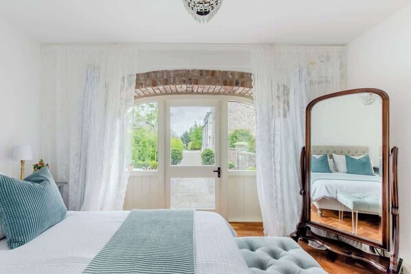 The bedroom has a colonial air with a luxurious king size bed featuring Egyptian cotton bedding. A beautiful Victorian oversized mahogany mirror, cherry wood parquet flooring and glass barn doors leading to a private patio make the bedroom a real feature of our space. The modern wet room has and electric shower and heated towel rail, underfloor heating and towels included.