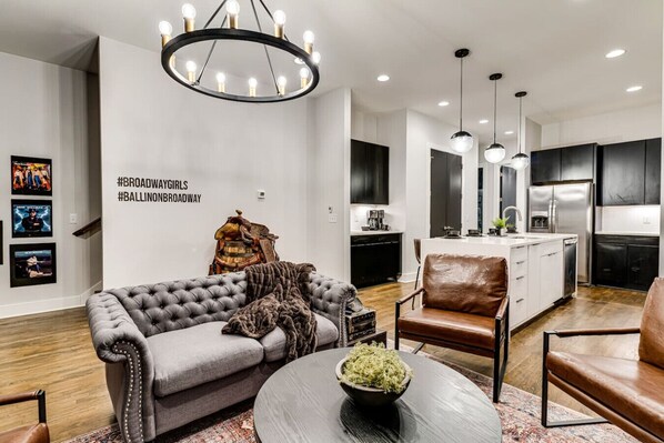 18 comfortable beds 4 full bathrooms Huge rooftop deck Game room with pool table Minutes from Downtown, Broadway, and top Nashville hotspots Fun photo op with a real saddle – perfect for `Ballin` on Broadway` Giddy up! 🤠